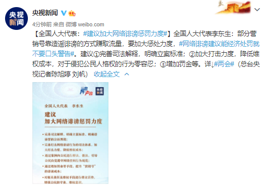【全国人大代表:#建议加大网络诽谤惩罚力度#】全国人大代表李东生:部分营销号靠造谣诽谤的方式赚取流量,要加大惩处力度,#网络诽谤建议能经济处罚就不要口头警告#。建议①完善司法解释,明确立案标准;②加大打击力度,降低维权成本,对于侵犯公民人格权的行为零容忍;③增加罚金等。详↓#两会#(总台央视记者陈旭婷 刘帆)