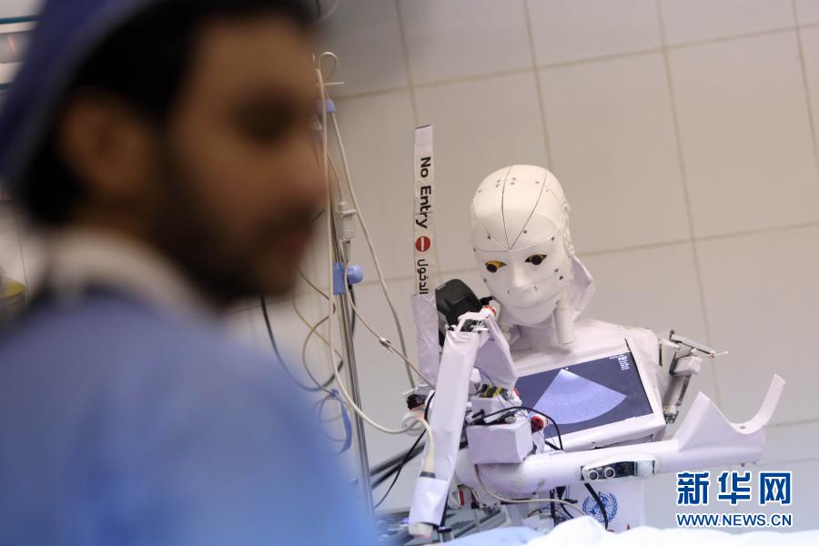 12月3日,在埃及坦塔的一所医院,Cira 03机器人对志愿者进行超声心动图检测。