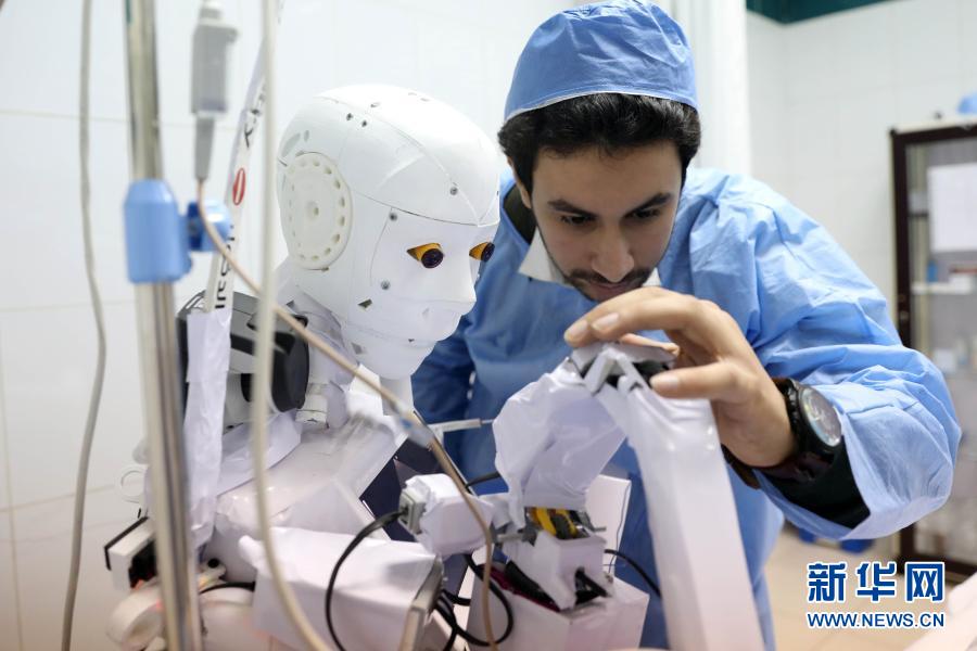 12月3日,在埃及坦塔的一所医院,马哈茂德·科米在Cira 03机器人附近工作。