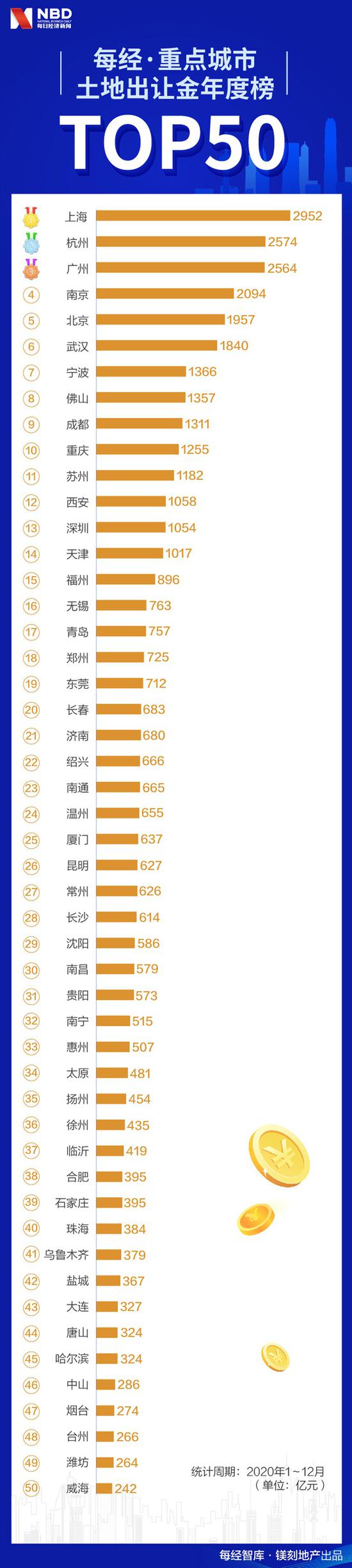 2020年,全国300城市土地出让金总额达59827亿元,同比增加16%。其中,TOP50城市土地出让金合计42063亿元,超过300城市总金额的7成。