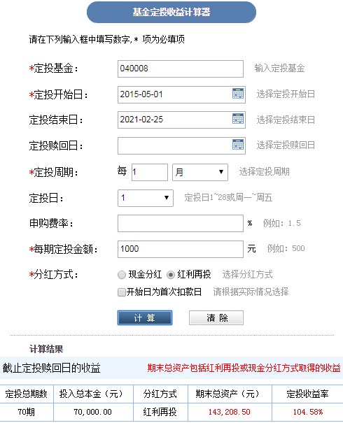 第二步,通过专业的定投计算器,来模拟定投的结果。假设每月1日,定投1000元,选定的基金为华安策略优选,选定市场高位作为定投开始的时间,比如2015年5月至2021年2月25日。以下是定投测算的结果:
