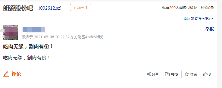 不过,股价表现再亮眼,还是有人欢喜有人忧,股价不可能一直涨,涨的越高,这期间的调整也会来的越发突然。5月7日,朗姿股份股价跌停。5月8日就有股民在股吧里表示:“吃肉无缘,割肉有份!”。